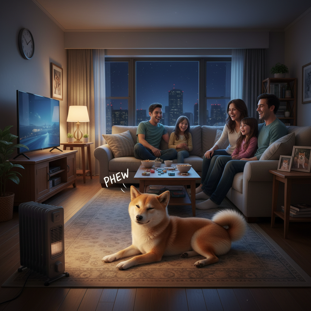 夜、家族がそれぞれの部屋に戻ったあと、柴犬はだいたい一階のリビングで寝る。たまに夜中にトイレで起きて階段を降りると、暗闇の中で柴犬の目が光ってて一瞬ビビる。向こうも「なんだ、お前か」みたいな顔してまた寝る。あの瞬間の、お互い無言で確認し合う感じ、嫌いじゃない。