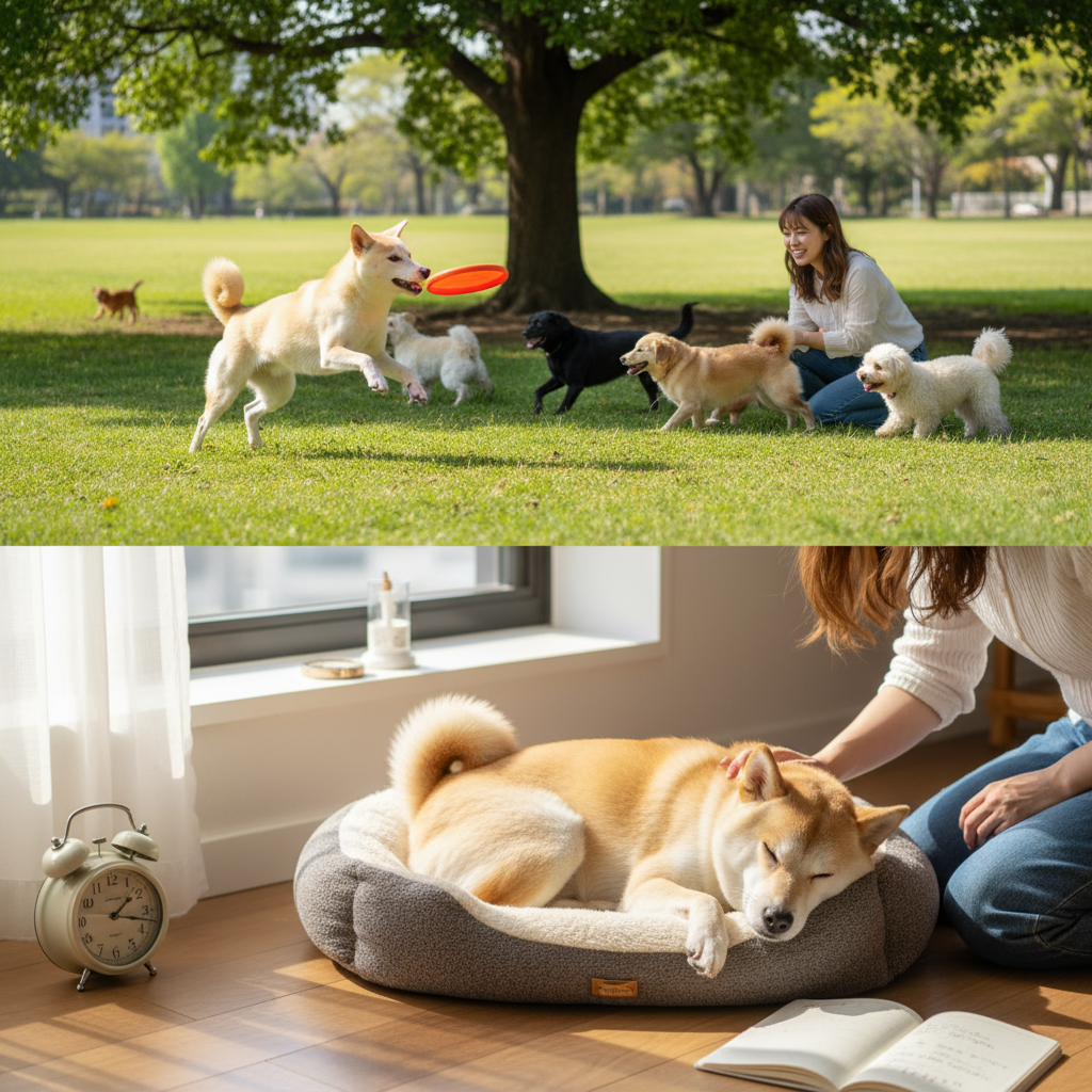 約2時間の公園での活動を終え、帰り道では少し疲れた様子のはなちゃんですが、まだまだ尻尾は元気に振っています。家に帰ると、水を飲んでからお気に入りの場所でぐっすりと昼寝を始めました。充実した表情で眠る姿を見ていると、今日も良い時間を過ごせたなと実感します。