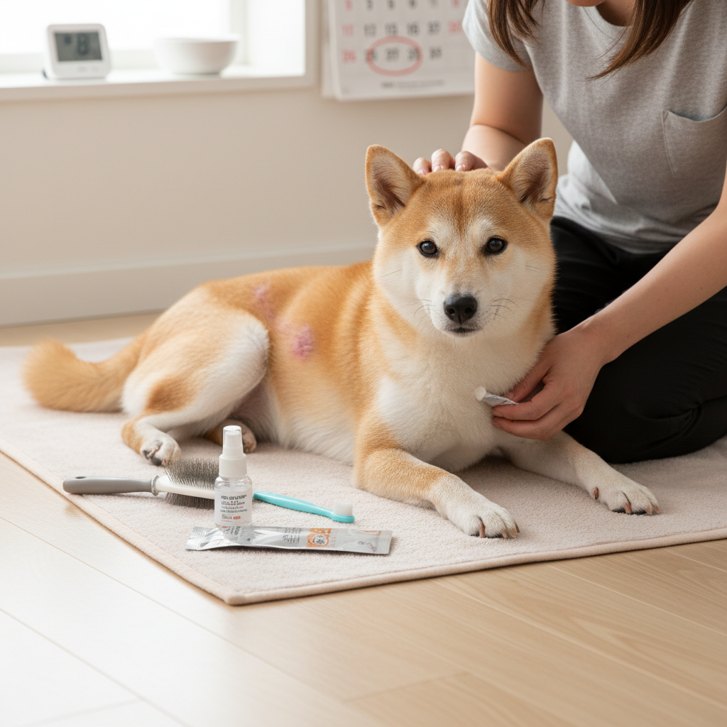 歯磨きはまだ苦戦中。歯周病も柴犬がかかりやすい病気のひとつで、放置すると歯が抜けちゃうこともあるんだって。毎晩チャレンジしてるけど、コタロウは歯ブラシ見ると逃げる。ガーゼで拭くだけでも効果あるって聞いたから、今はそっちでやってる。いつか歯ブラシに慣れてくれる日が来るといいんだけど。