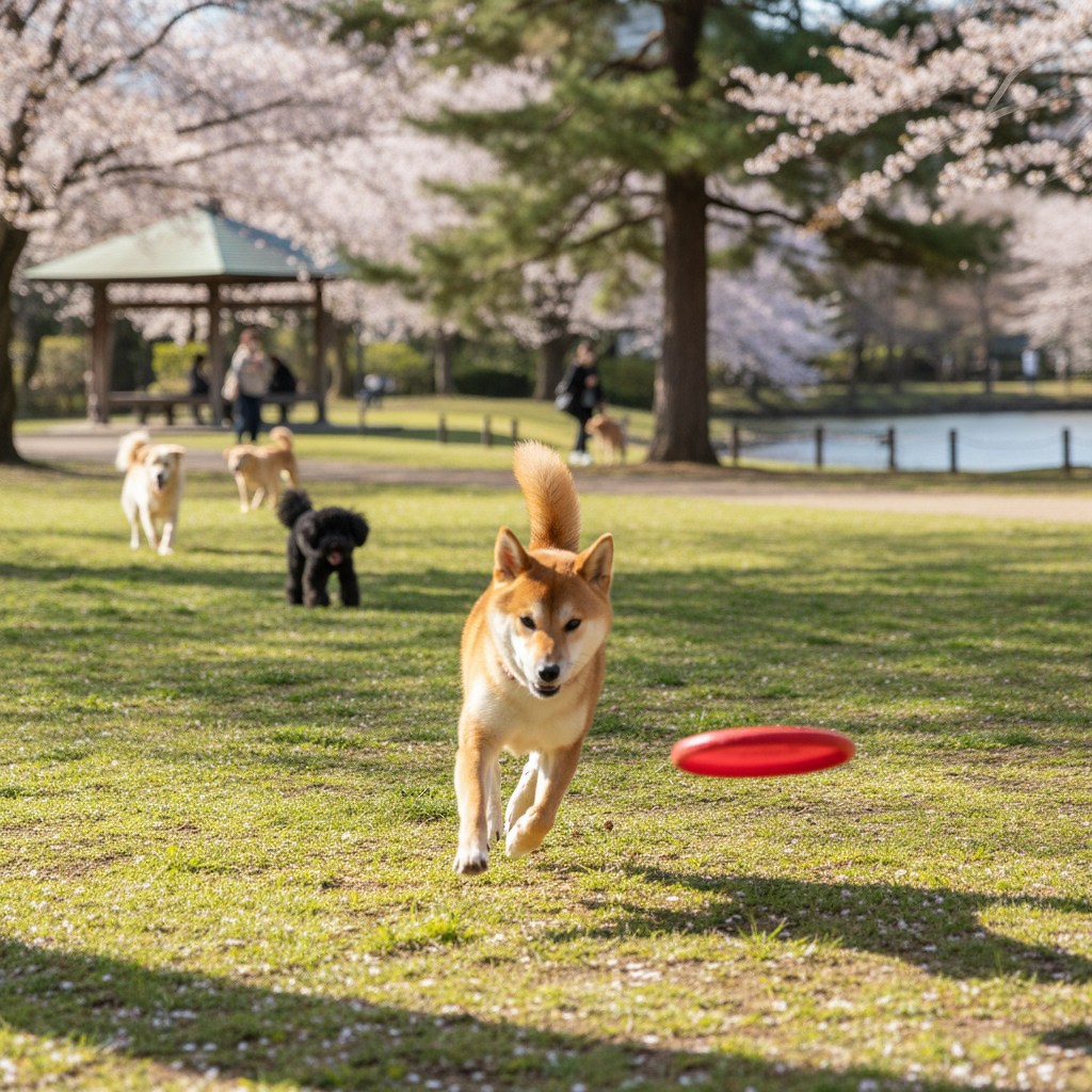 柴犬との外遊びで特に重要なのは、適度な運動量の確保です。太郎の場合、朝晩の散歩に加えて、週に数回このように公園で思い切り体を動かす時間を設けています。柴犬は本来、狩猟犬として活躍していた犬種。その活発な性質を考慮すると、十分な運動は心身の健康維持に欠かせません。